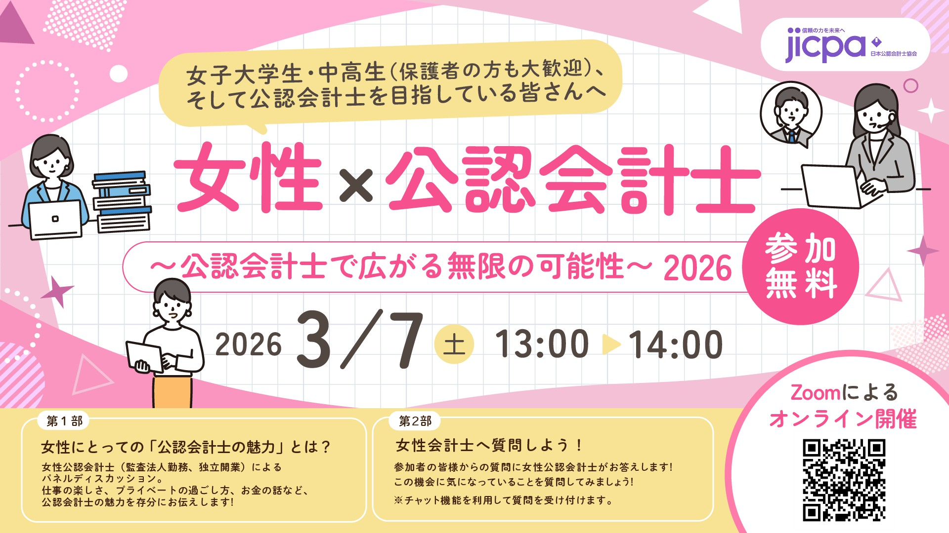 女性会計士活躍促進協議会では、活躍する女性会計士が公認会計士の魅力を語るオンラインイベントを以下のとおり予定しております。